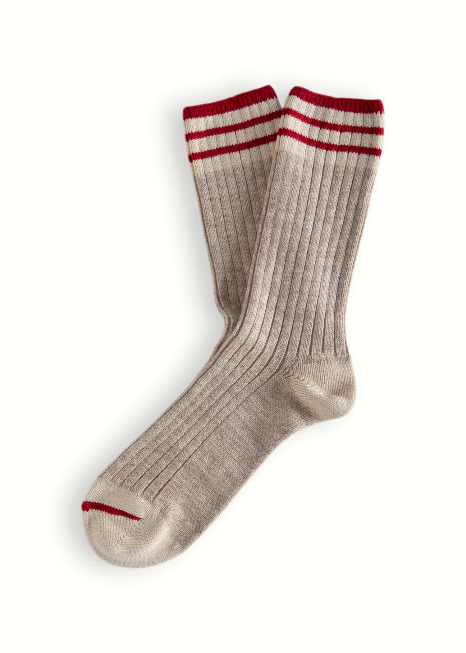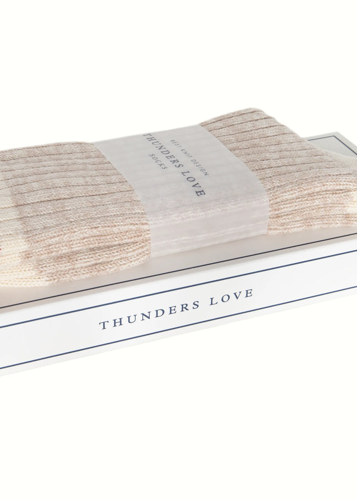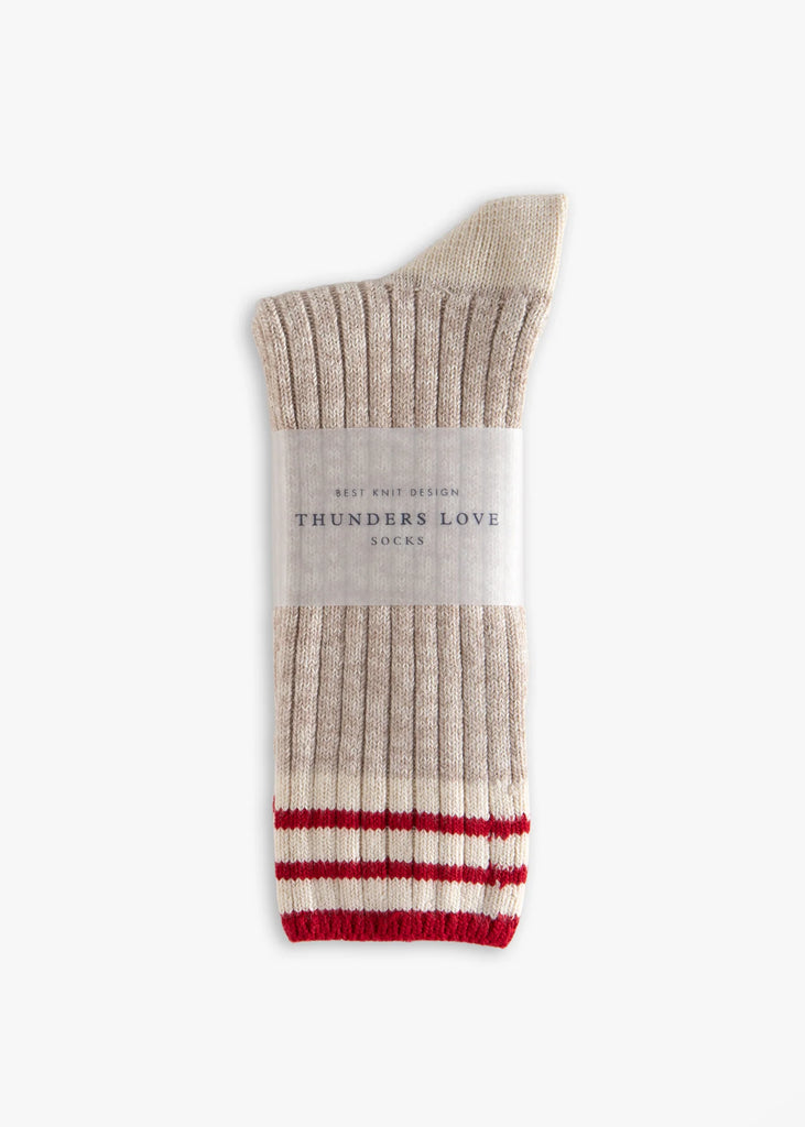 Thunders Love Oceanside Socks are inspired by the sea as the others socks of this collection, As such, we created a sock in a melange of soft brown and raw white mixing yarns with these two colours, and an upper part in Beige with three stripes in a red tone. We complete the design with a chromatic detail in the tip and in the heel, and on the tip a detail in red. Besides that, we use Egyptian cotton to create a soft, delicate and resistant texture. We also introduce rib knitting in all the socks getting a perfect fit and our hosiers finish the garment by hand.